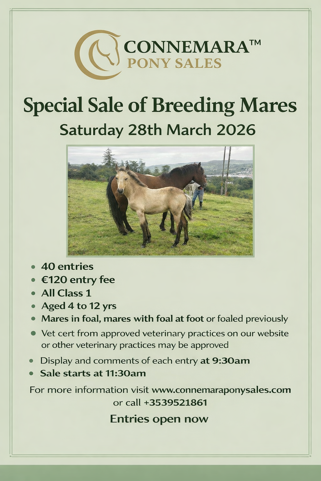Connemara Pony Sales are Europe’s largest and leading sale of Connemara Ponies and Horses. Based in Clifden, the heart of Connemara which host sales held annually in February, April, May, August, September, October, November and December bringing together horse & pony buyers and sellers from around the globe.