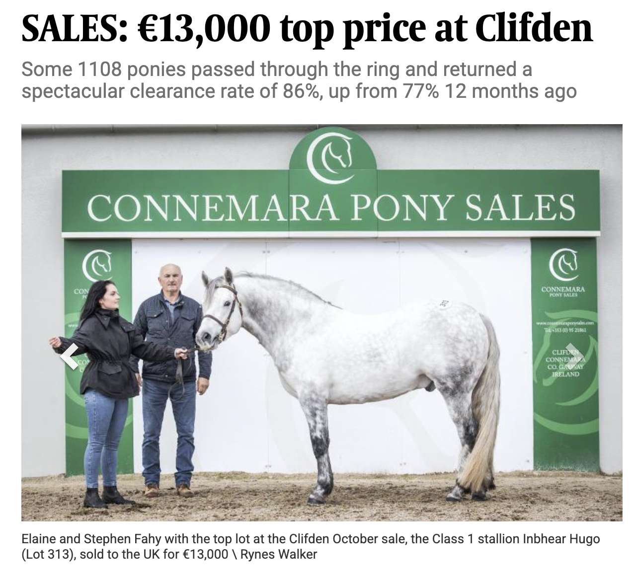 Connemara Pony Sales are Europe’s largest and leading sale of Connemara Ponies and Horses. Based in Clifden, the heart of Connemara which host sales held annually in February, April, May, August, September, October, November and December bringing together horse & pony buyers and sellers from around the globe.