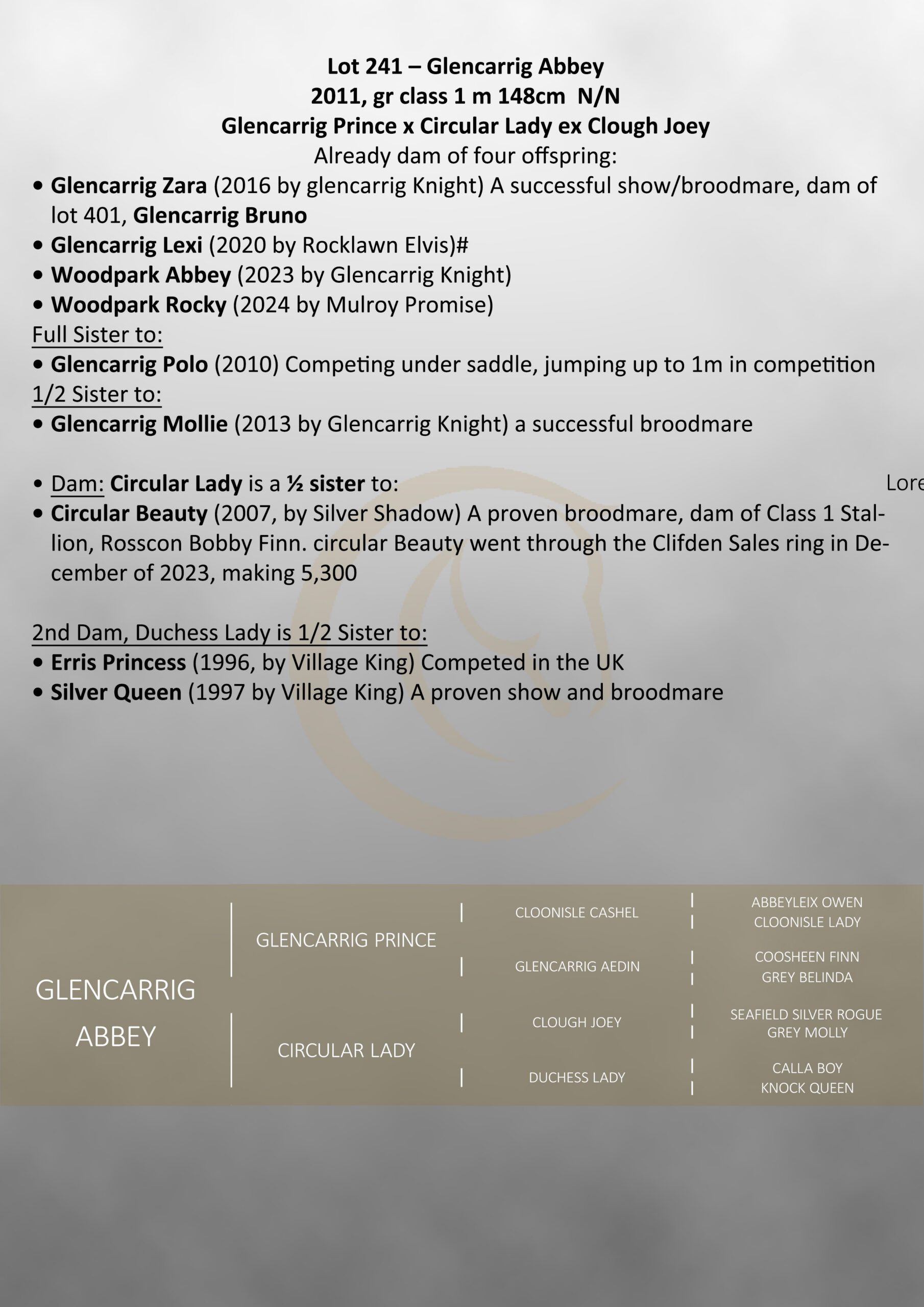 Circular Beauty (2007, by Silver Shadow) A proven broodmare, dam of Class 1 Stallion, Rosscon Bobby Finn. circular Beauty went through the Clifden Sales ring in December of 2023, making 5,300